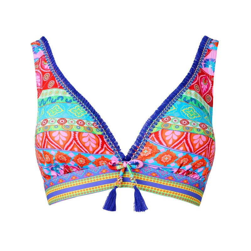 - Boasting sunshine-ready colours, a patchwork print, and tassel trims, this bikini top oozes boho style.
