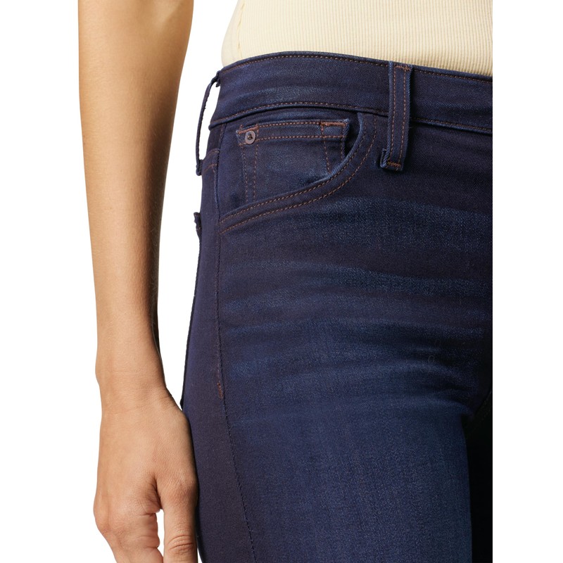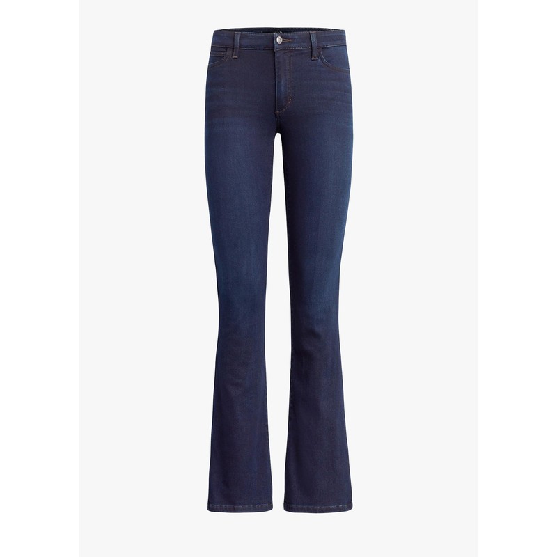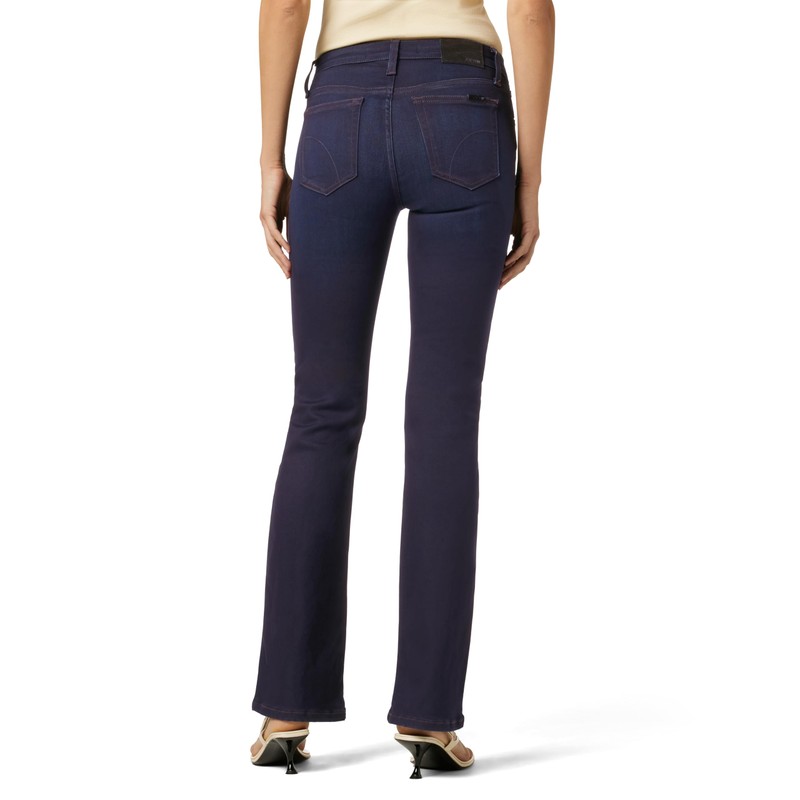 - Bootcut jean in dark blue stretch denim featuring subtle hip whiskers and front fade