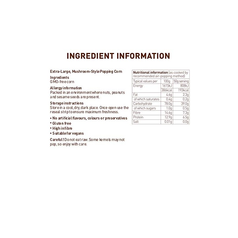 Product DescriptionJoe & Seph's mushroom shaped popping kernels are perfect for popping at home. Popping corn is suitable for any popcorn cooking method, including on the hob, in the microwave or with any popcorn maker machine. Mushroom kernels are larger than butterfly kernels and their increased surface area makes them ideal for picking up seasoning and flavour.IngredientsGMO Free CornDirectionsJoe & Seph's recommend air-popping your corn for the best resultsSafety WarningDo not eat raw. Some kernels may not pop, so remove these and enjoy with care! Packed in an environment that handles nuts, peanuts and sesame seeds.Manufacturer Contact Information1000 North Circular Road