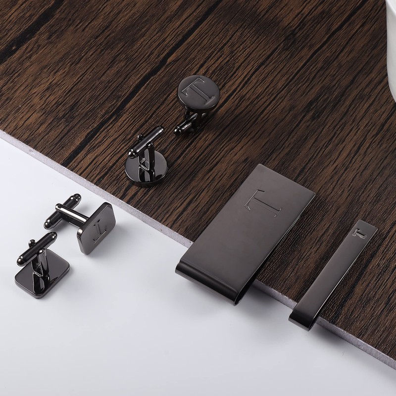 - 【TRENDY PACK】 6 PCS Set of Modern Style Men's Jewelry, Each Set Includes 2 Pair of Cufflinks, Matching Tie Bar and Money Clip with Engraved Letters. Affordable Price and Quality Workmanship, Great Idea for Wedding - Groomsmen with Matching Jewelry Details.