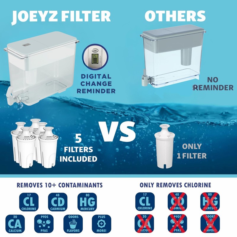 • THE 30 CUP DISPENSER: The Joey'z Pitcher is a practical and convenient BPA-free 30-cup filtered water pitcher, featuring a user-friendly design with an easy-fill lid and a comfortable grip handle. Notably, it comes equipped with an electronic filter change indicator, ensuring that you're always aware of when it's time to replace the filter, for consistently clean and refreshing water. Its durability and sleek appearance also make it a stylish addition to any kitchen or dining area.