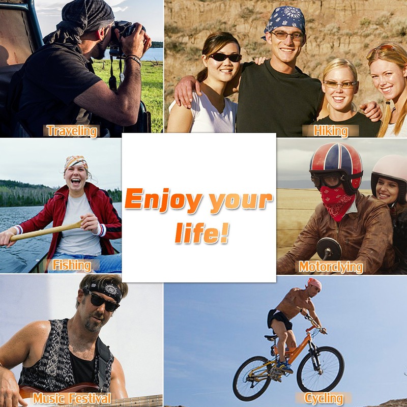 - SUN PROTECTION AND DUST PROOF: When going out for running, cycling or motorcycling, wearing it as a face mask, headband, scarf bandanna or neck gaiter can protect your face, head, neck and ears from being over exposed to the rays of the sun and keep your nose, mouth from breathing dust.