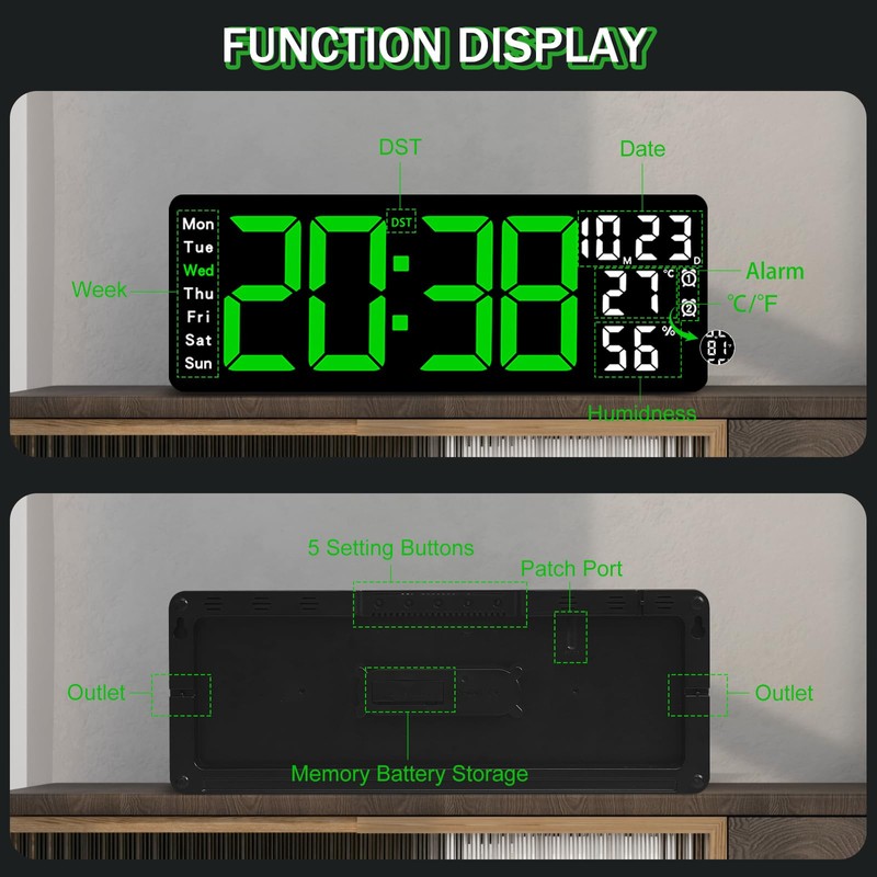 • 【17.3” Large Display & Multi-Function】 JoFomp digital wall clock large display shows the time with a large 17.3” LED display, no matter where the LED digital wall clock is placed, the oversized digital features prompt us to see the time better. The wall digital clock has many different functions: time, date, week, temperature, humidity, dual alarms, 10 brightness levels (auto/manual), timer, DST, ambient light, etc.