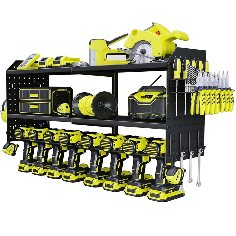 Jofuas Power Tool Organizer Wall-Mounted Metal Tool Rack for 8 Drill Bits with 2 Side Pegboards, Garage Organizing Storage Shelf with Screwdriver Holder/Plier Holder/Hammer Holder.