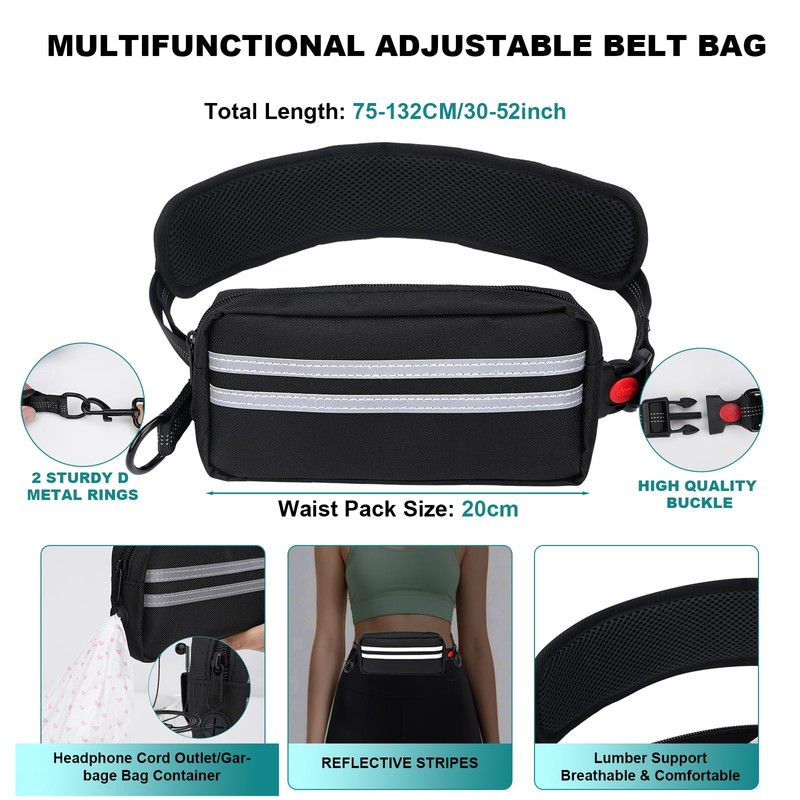 - Reflektierende Designs für Nacht Sicherheit: Reflektierende Streifen sind sowohl in der Mitte der Gürteltasche als auch entlang der gesamten Laufleine angebracht, um die Sichtbarkeit bei nächtlichen Aktivitäten zu erhöhen und somit mehr Sicherheit für Sie und Ihren Hund zu bieten.