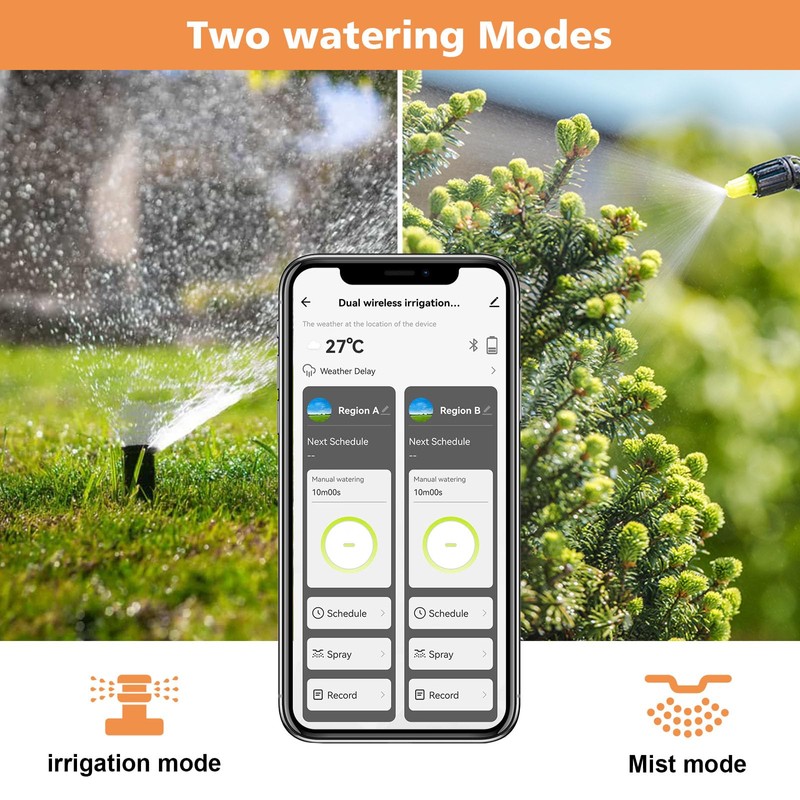 - TWO IRRIGATION MODES: The wifi hose timer has a timed irrigation mode and a spray mode. In irrigation mode, up to 5 watering procedures can be customized per outlet and the duration can be adjusted. The spray mode allows flexible adjustment of runtime and interval time. Both modes support weekly cycle frequencies. Help you fully save water bills.