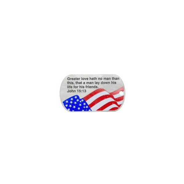 - DESIGN - Anyone wishing to illustrate devotion to God and country can find these 4 Pack dog tag necklaces to be inspiring and spiritually uplifting. One side of the dog tags feature the inscription of John 15:13. Under this passage waves a vibrantly colored American flag. The reverse side of the dog tags invokes a reminder of God's constant presence with the Prayer of Salvation. Shields of Strength is a Texas based Company. We stand behind our designs.