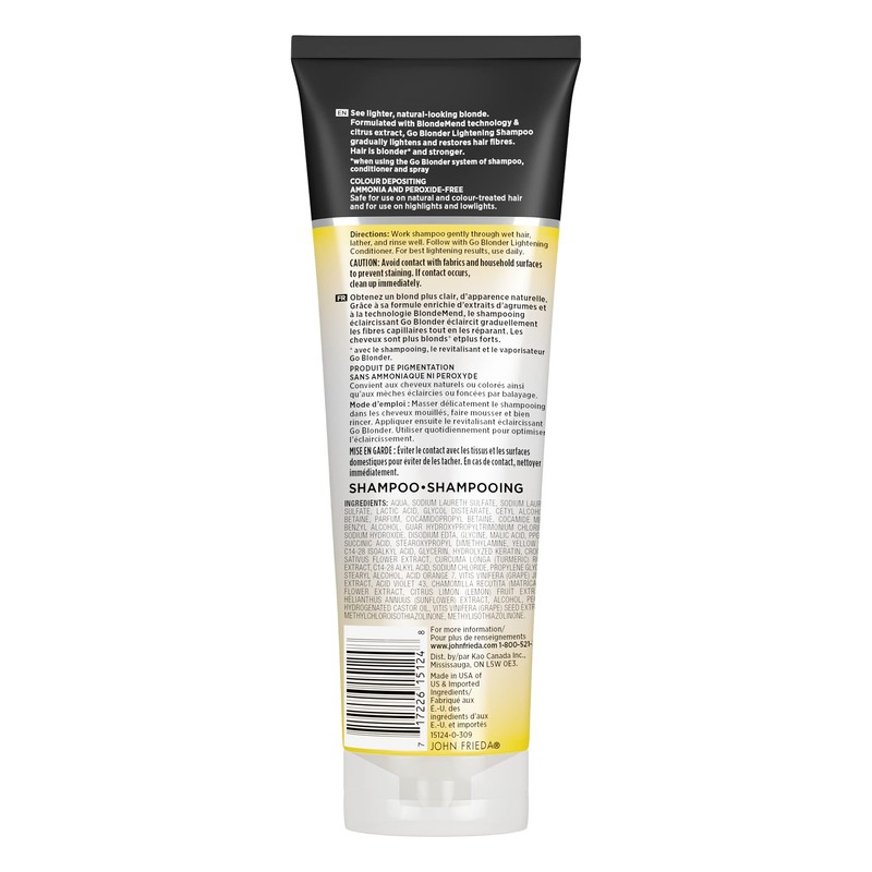 - Go Blonder Shampoo: Gradually deposits yellow tones for visibly lighter, brighter blonder hues. Work gently through wet hair, lather & rinse well. Follow with Sheer Blonde Go Blonder Lightening Conditioner. Use daily to optimize lightening. Ammonia and peroxide-free.