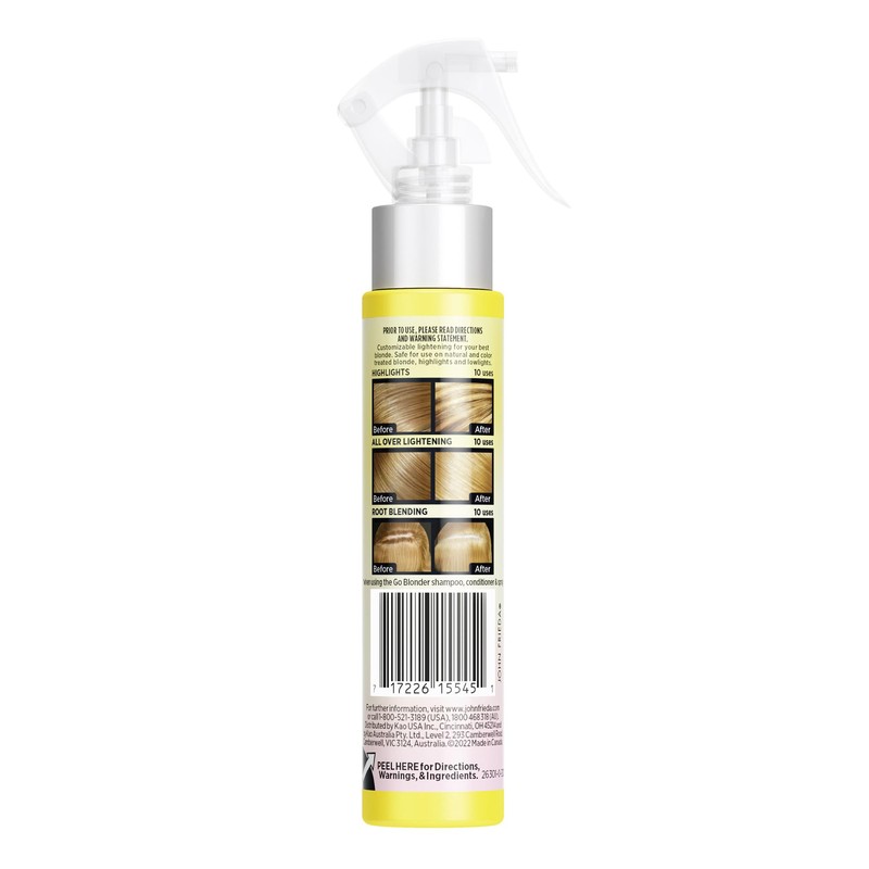 This expertly formulated spray for blonde hair helps gently lighten blonde by up to two shades for natural-looking blonde. This exclusive peroxide lightening formula gradually lightens in as few as 3-5 uses. Maximum hair lightening occurs after no more than 10 uses. Lighten all over, or as a root touch up to blend dark roots and lighten roots by up to two shades. Use the John Frieda Go Blonder shampoo and conditioner and Go Blonder Lightening Spray to lighten and tone for optimal, natural-looking lightening. Safe for use on natural, color treated blonde, highlights and lowlights. Not recommended for white, platinum, or cooler blonde tones. Paraben Free, Phthalate Free, Ammonia Free, Cruelty Free blonde spray.