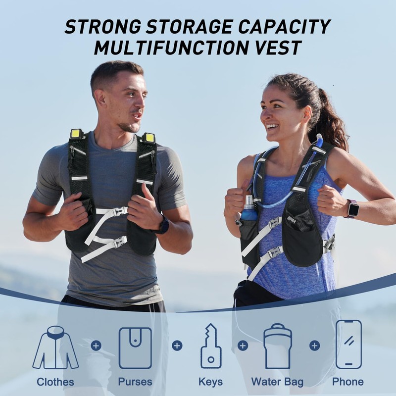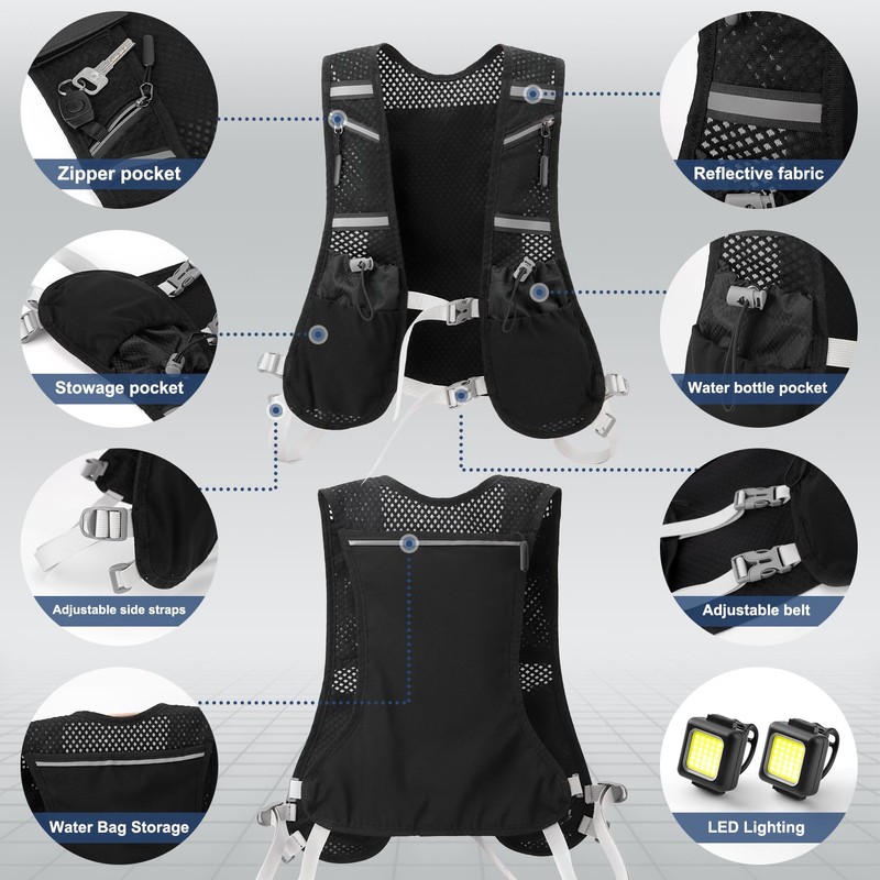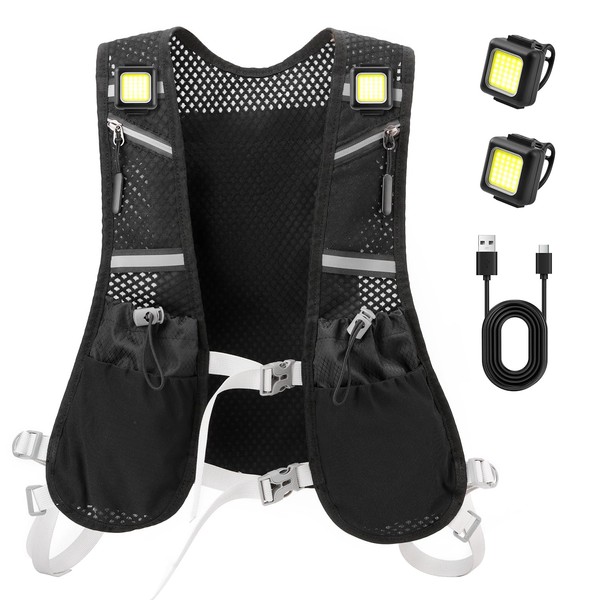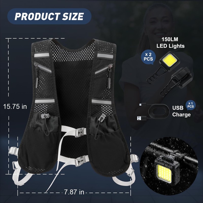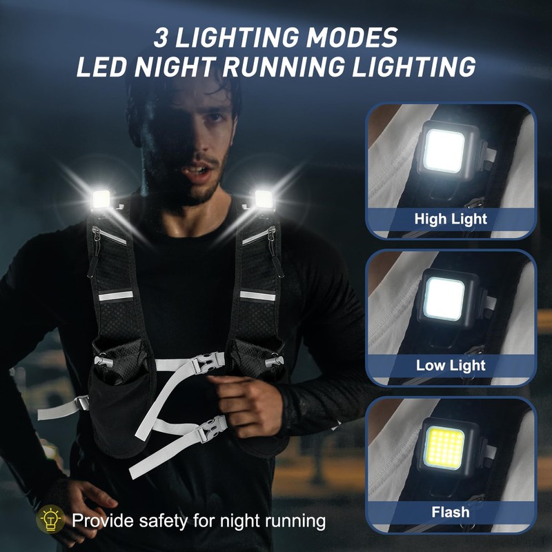 - 【RUNNING VEST WITH LED LIGHTS】: Running vest is equipped with 2pcs 150LM LED lights with USB charging, IPX5 waterproof, 30pcs light beads provide 3 lighting modes (strong light, low light, flash) to illuminate and alert pedestrians at night, and also can be hung on the ends of the shoulders to keep visibility in darkness and serve as a warning at the same time.