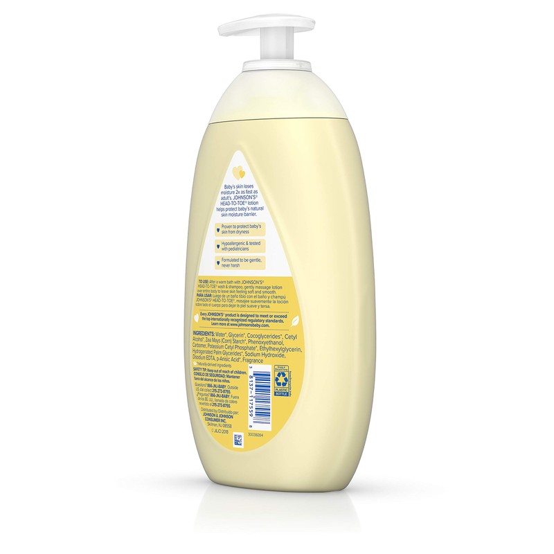 Johnson's Head-to-Toe Baby Lotion provides gentle hydration to soothe delicate skin and helps protect it from dryness, leaving it feeling soft and smooth. Specially formulated for babies and gentle enough for newborns, this baby lotion is ultra-mild, pH-balanced to baby skin and pediatrician-tested. This hypoallergenic baby lotion is free of parabens, phthalates, sulfates, dyes, and harsh fragrances. Use this moisturizing baby lotion as part of your regular baby skin care routine by applying after bathtime for a nurturing massage that enriches the senses and gently moisturizes your little one's skin.