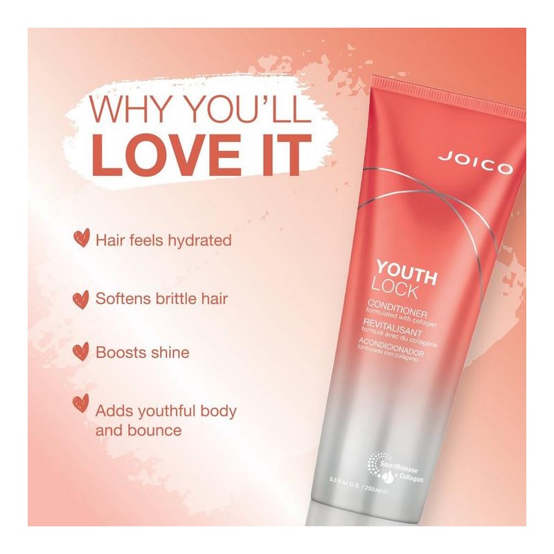 What are the benefits and features of Joico YouthLock Conditioner 250ml?- Moisturizes and hydrates dry, brittle hair.