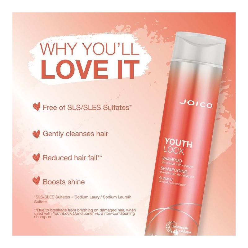 What are the benefits and features of Joico YouthLock Shampoo 300ml?- Gently cleanses hair, reducing hair fall and boosting shine.