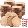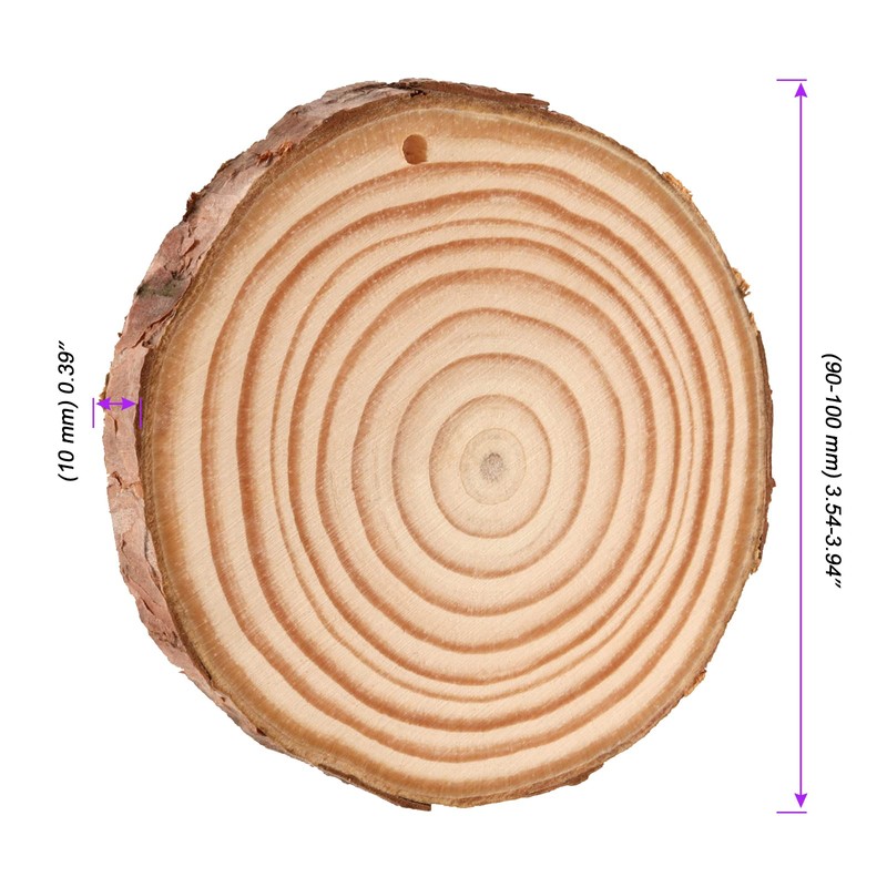 - WHAT YOU GET - You can get 50 pieces of predrilled wood slices. They are pre-cut into 0.4 inch thick wood slices which come in sizes ranging from 3.5-4 inches in diameter. Each of them has been selected from quality wood piece and processed under strict moisture control to prevent drying or cracking. The package also includes 2 pieces of 33ft red/white cotton twine and 2 jute twine for making hanging tags and ornaments.