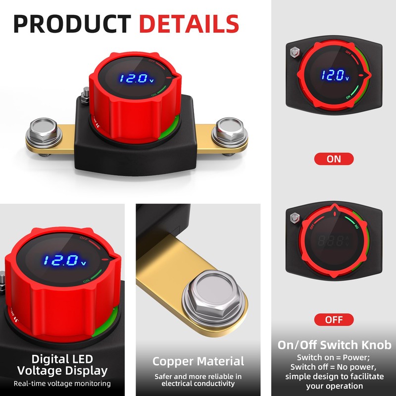 LED Digital Voltage Display: This side post battery disconnect switch 12v comes with LED digital voltage display, you can see your battery voltage as soon as you turn it on, and it will not drain your battery when turned off. It is more convenient for you to check your battery voltage in real time. The digital display function allows you to keep track of your battery status at any time and protect your battery;