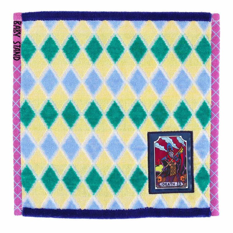 This towel handkerchief is inspired by the Manish Boy and the Death Certeen on the stand. The colors are taken from the amusement park scenery and the Death Thirteen costume. The "BABY STAND" wound on the arm that was damaged by the Hanakoin in dreams. The bottom right is embroidered with applique printed Death Thirteen tarot cards. Jacquard woven character image The uneven surface makes it a fun piece. Made of highly absorbent material, this item is highly practical and will make you want to carry it around every day. Introducing a product that incorporates the image of JoJo's Bizarre Adventure Stardust Crusaders anime characters. Available in a line of handkerchiefs, towels, pouches, and more, each item has a special design that will appeal to any fan. Great for short outings, as well as for school and office.