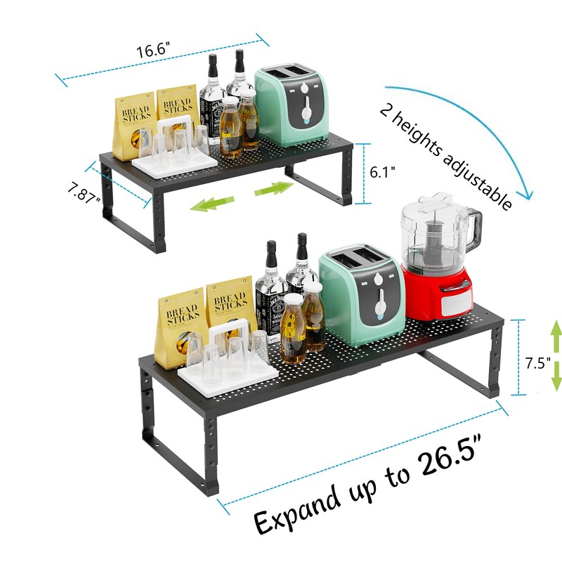 - ⭐【Expandable & Stackable Cabinet Organizer】: The length and height of this kitchen counter shelf organizer can be adjusted to your desire. The original countertop shelf measures 16.54~26.38" L x 7.87/9.84" W x 6.2~7.48" H. The length can vary from 16.54 inches to 26.38 inches in length depending on how you want to arrange your space. It also can be easily stacked to a 2 tire spice shelf, or used separately as 2 single shelves.