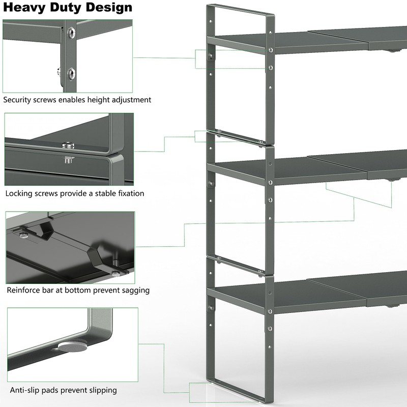 • 【DURABLE &STRONG】:Cabinet Shelf Organizers is made of sturdy metal with anti rust coating,there is a metal support rod in the middle of these cabinet shelves,it can ensures the shelf didn’t get collapse when you place some heavy items on it,the screws at the metal rod are can be loose or tight to expand the countertop shelves