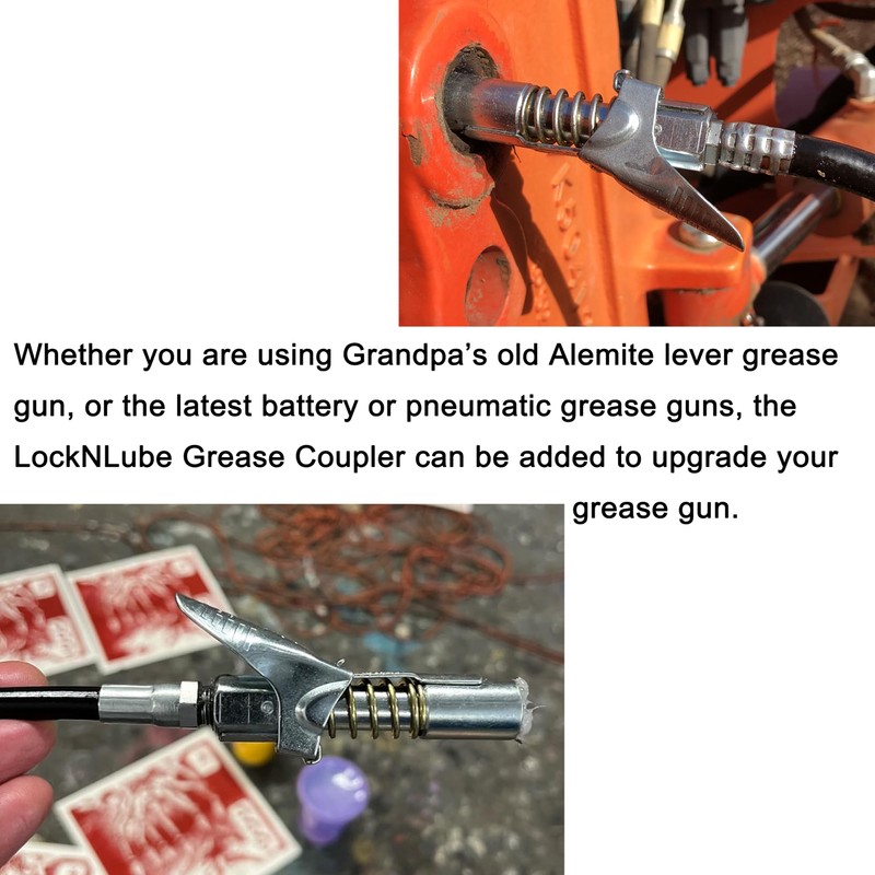 - 1/8" NPT COMPATIBLE WITH ALL GREASE GUNS - BATTERY, PNEUMATIC, MANUAL: Whether you are using Grandpa’s old Alemite lever grease gun, or the latest battery or pneumatic grease guns, the LockNLube Grease Coupler can be added to upgrade your grease gun.