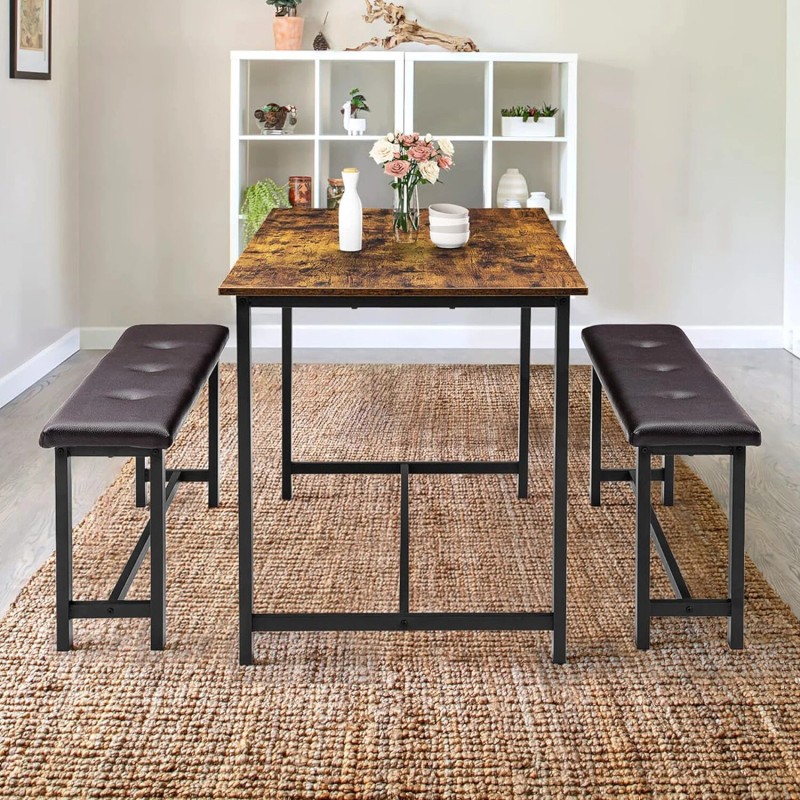 Jojoka Dining Set Table and 2 Upholstered Bench Wood Top Breakfast Dinette for Kitchen - Brown