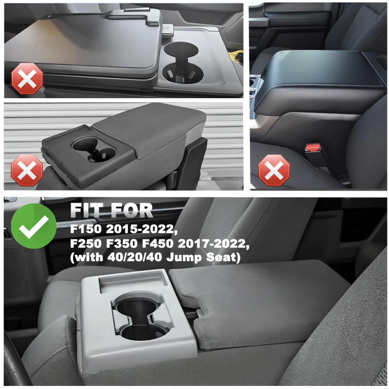 - CompatibilityThe center console cover is for jump seat console only.NOT for bucket seat console and the console with work surface. Compatible with Ford F150 models from 2015-2024, as well as F250, F350, F450, and F550 models from 2017-2024 with the 40/20/40 jump seat console. This ensures a perfect fit for your truck, Must-have interior accessories for your truck.