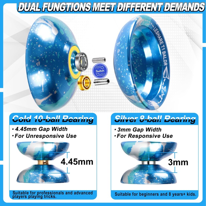 - Dual Functions: JOLESHARE Professional YoYo can replace bearings as needed. t-bearings are responsive and will return automatically after being thrown with a gentle pull, suitable for beginners and adults; u-bearings are not responsive and will not return automatically after being thrown, so you need to learn binding skills to make the yo-yo return. Suitable for the perfect choice for professionals, beginners, or anyone who wants a high-performance yo-yo. (1A, 3A, 5A)