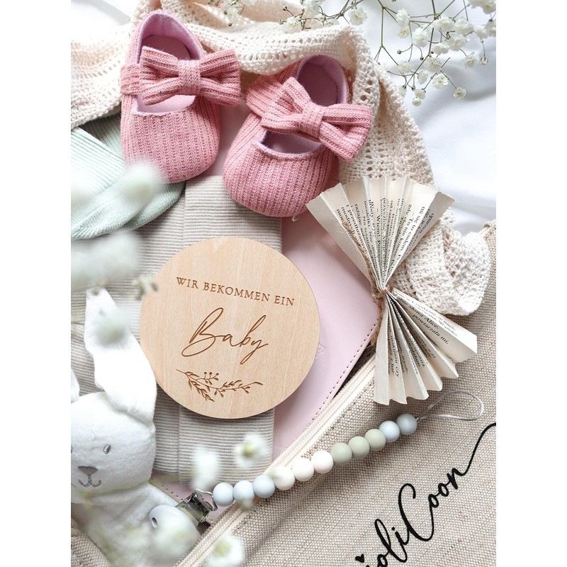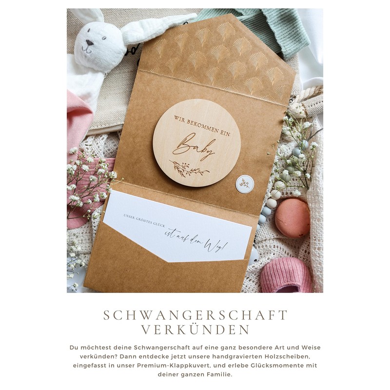 - Unique, special and very personal. Discover our pregnancy announce wooden discs, fitted into our premium folding envelope with matching adhesive seal.