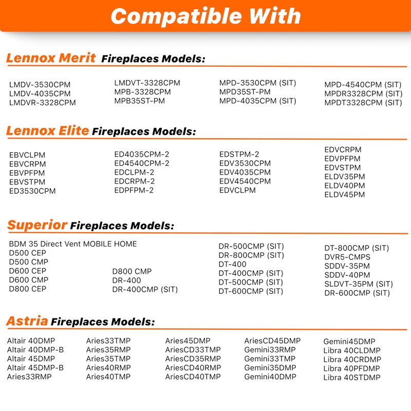 - Fits Lennox Merit Fireplaces Models:LMDV-3530CPM,LMDV-4035CPM,LMDVR-3328CPM,LMDVT-3328CPM,MPB-3328CPM,MPB35ST-PM,MPD-3530CPM (SIT),MPD35ST-PM,MPD-4035CPM (SIT),MPD-4540CPM (SIT),MPDR3328CPM (SIT),MPDT3328CPM (SIT)