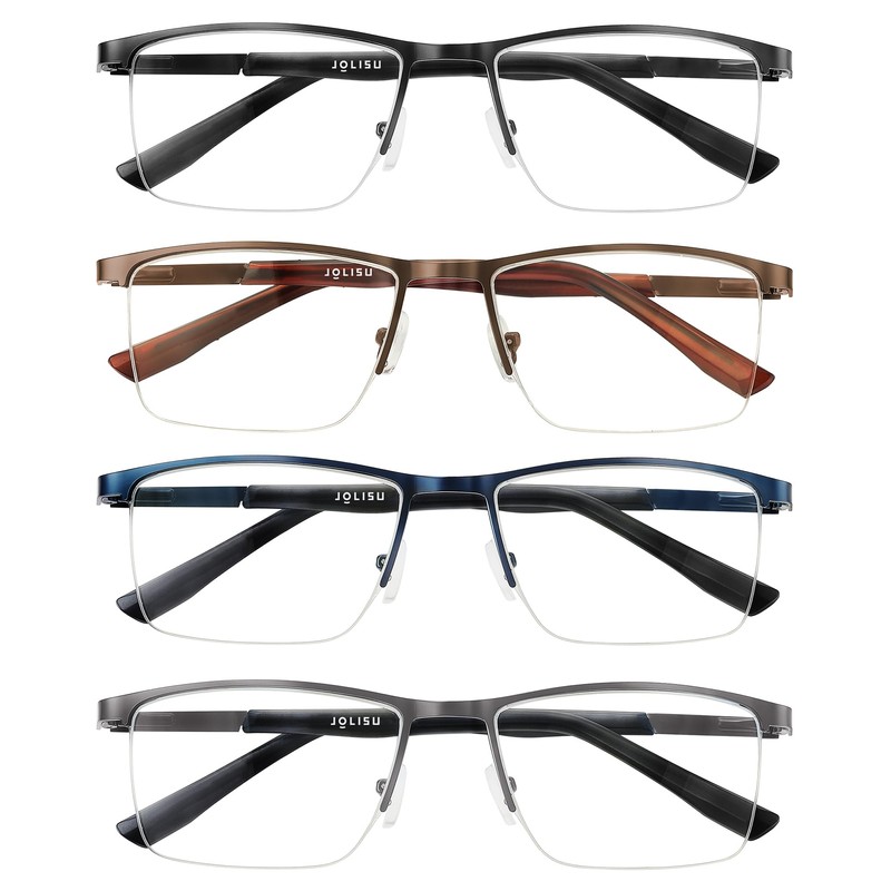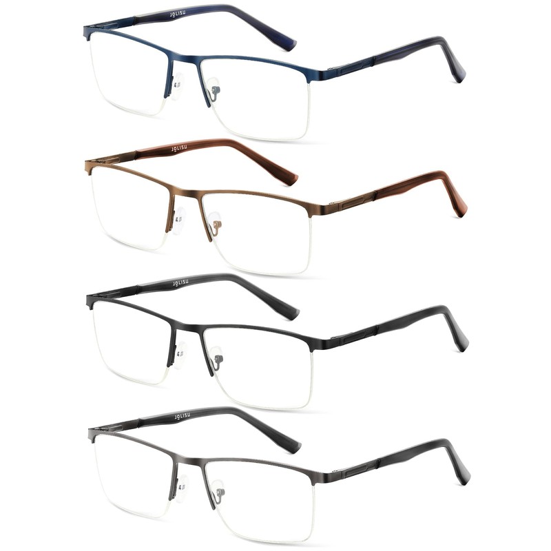 JOLISU 4 Pack Blue Light Blocking Reading Glasses for Men, Half Frame Metal Readers Spring Hinge Eyeglasses 3.50