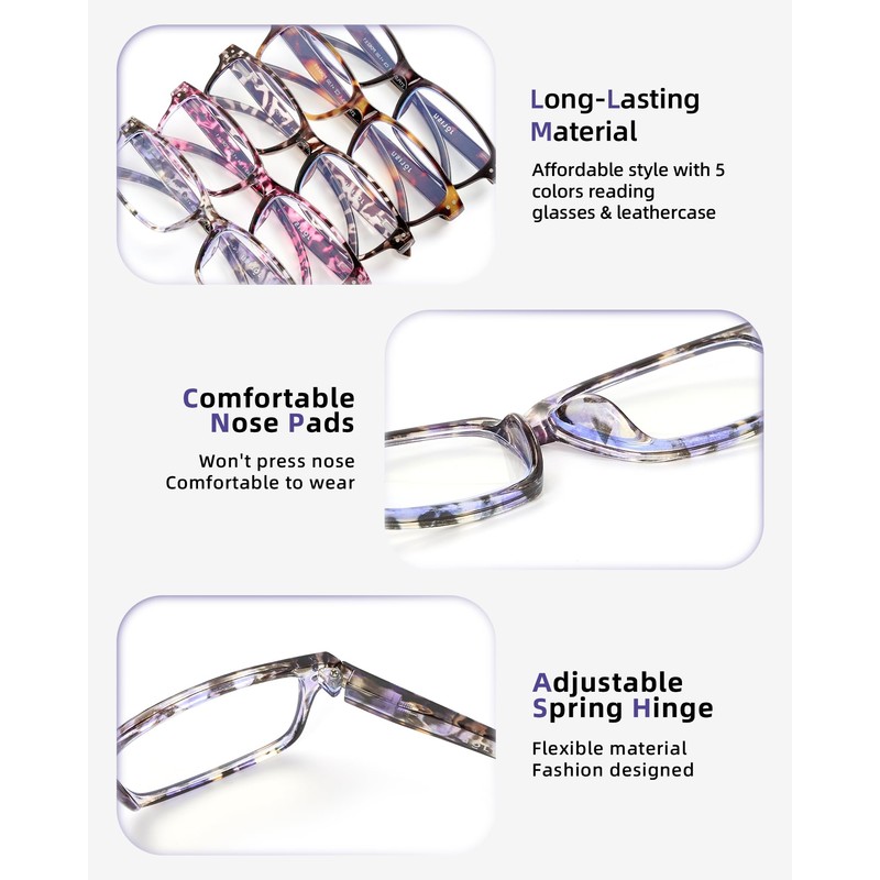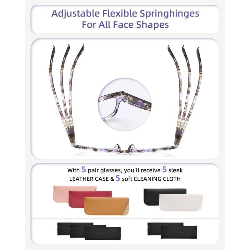 Elegant Blue Light Blocking Reading Glasses for Women: Crafted with quality PC materials, these stylish women's reading glasses not only effectively shield against harmful blue light from digital screens to relieve dry eyes, glare and eye strain, but also feature precisely magnified, scratch-resistant lenses for enhanced clarity and true color restoration. Flexible spring-hinged design offers a comfortable, customized fit, complemented by a stylish tortoiseshell frame readers, 5*PU leather case and 5*cleaning cloth for a complete premium user experience.The cost-effective 5 sets of different colored glasses can be placed in different leather case and will allow you to put them everywhere at home and at work, no longer having to worry about the risk of losing your glasses.