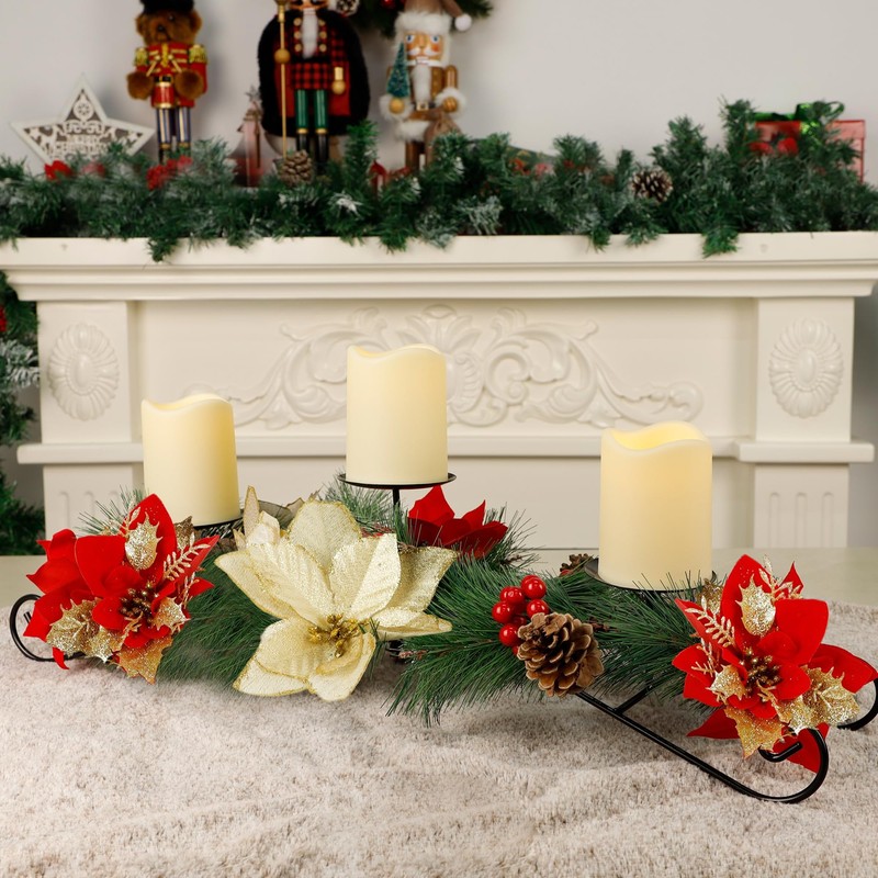 - EXQUISITE CRAFTSMANSHIP: Joliyoou Christmas candelabrum is constructed from high-quality metal and coated with waterproof black paint, ensuring durability and sturdiness. The beautifully adorned golden and red poinsettia flowers, pinecones, and red berries are meticulously attached by hand and add wonderful Christmas touches