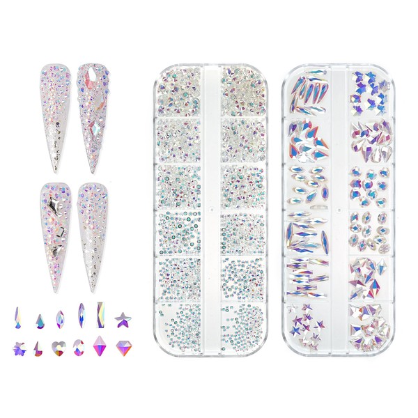 Jollin 1920 Pieces Flat Back Rhinestones Glass Pendants Gems for Nail Art Assorted Shapes Transparent AB