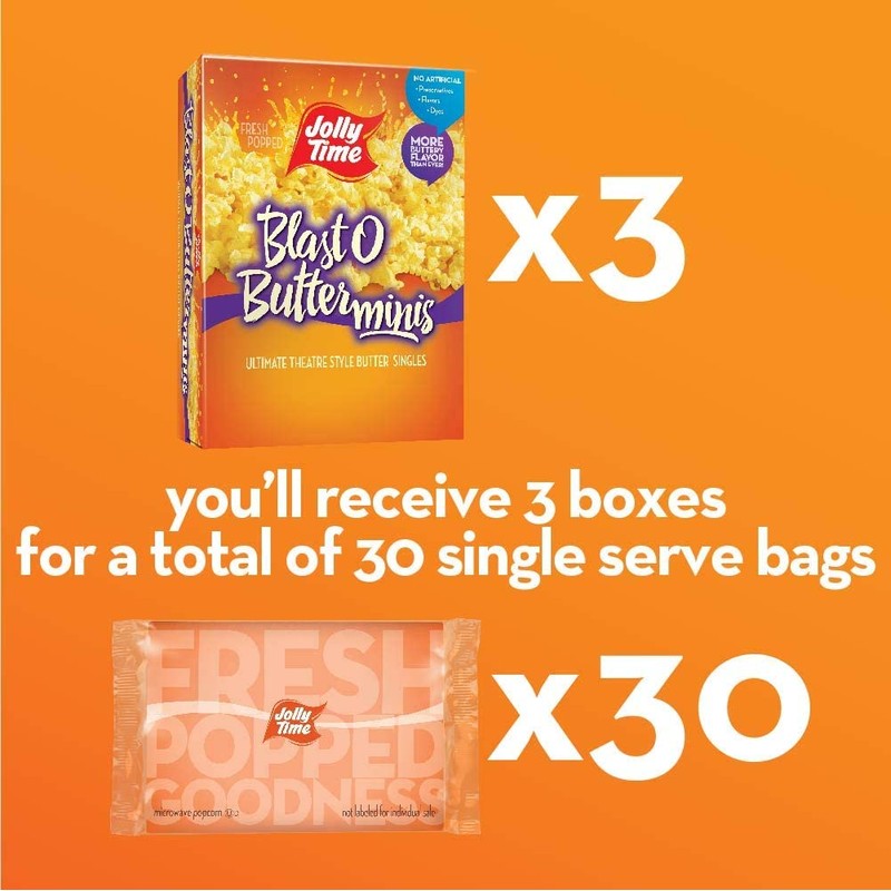 The same Blast O Butter movie theatre style popcorn you love in a snack-size mini bag! This full flavor popcorn for extreme butter lovers delivers an intense, savory movie theatre butter flavor in every bite. The JOLLY TIME team worked for over a year developing the most genuine butter flavor they could find without compromising the popcorn's crunchy texture. Developed 20 years ago, Blast-O-Butter shattered all company sales records and became the industry's best selling full-flavored butter microwave popcorn. Not only does it taste great; Blast O Butter microwave popcorn is cholesterol-free, 100% whole grain, high in fiber, gluten free, and made with non-GMO popcorn kernels. Blast O Butter minis offer hot, fresh movie theater buttered popcorn flavor packed into a single serving portion control bag. A great snack for kids and adults, blasting with flavoring that's creamy, explosive, and thoroughly fun - with no artificial aftertaste. Pop up a bag at work as an afternoon snack or meal substitute at lunch, for your kids after school, in the car when you are on the go, or after dinner as a treat to enjoy in front of the TV. The convenient, portable single serving size allows everyone to have their own bag of microwave popcorn - and you can finish the whole bag without feeling guilty! One mini bag of Blast O Butter pops up 4.5 cups of popped popcorn containing 4g dietary fiber, 3g protein, 0g cholesterol, and only 210 calories. All JOLLY TIME microwave popcorn is Gluten-Free and made with Non-GMO popcorn kernels. Our customers continue to rave about Blast O Butter: "When I want popcorn I want the good stuff and this is the best we have found!"..."Absolutely the best microwave pop corn I have ever had."..."This popcorn is the best of the bunch. Very fresh tasting with just the right amount of flavoring." You will be receiving 3 boxes of JOLLY TIME Blast O Butter Microwave Popcorn Mini Bags. Each box contains ten 1.5 oz. bags, for a total of 30 mini bags.