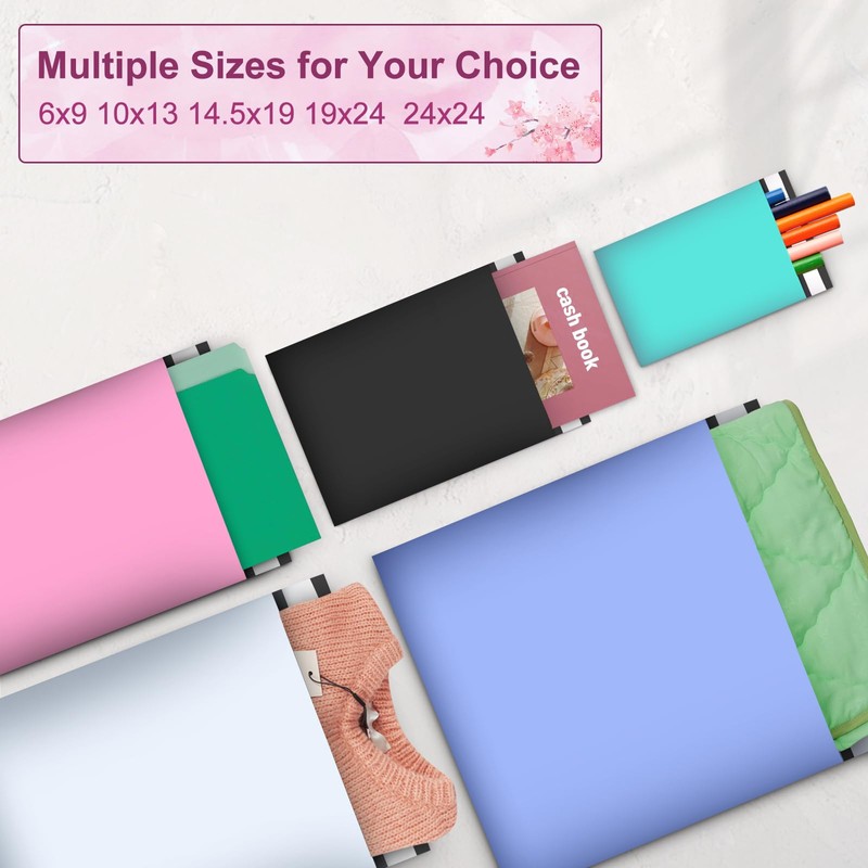 - Eye-Catch Poly Mailers Bags--- Usable size: 14.5x19 Inch, 100Pack. These shipping bags have a sakura pink outer surface, and gray inner lining, a highly attractive color that makes your products look better. Their smooth texture makes it easy to affix self-adhesive stamps and address labels, helping you customize your brand.