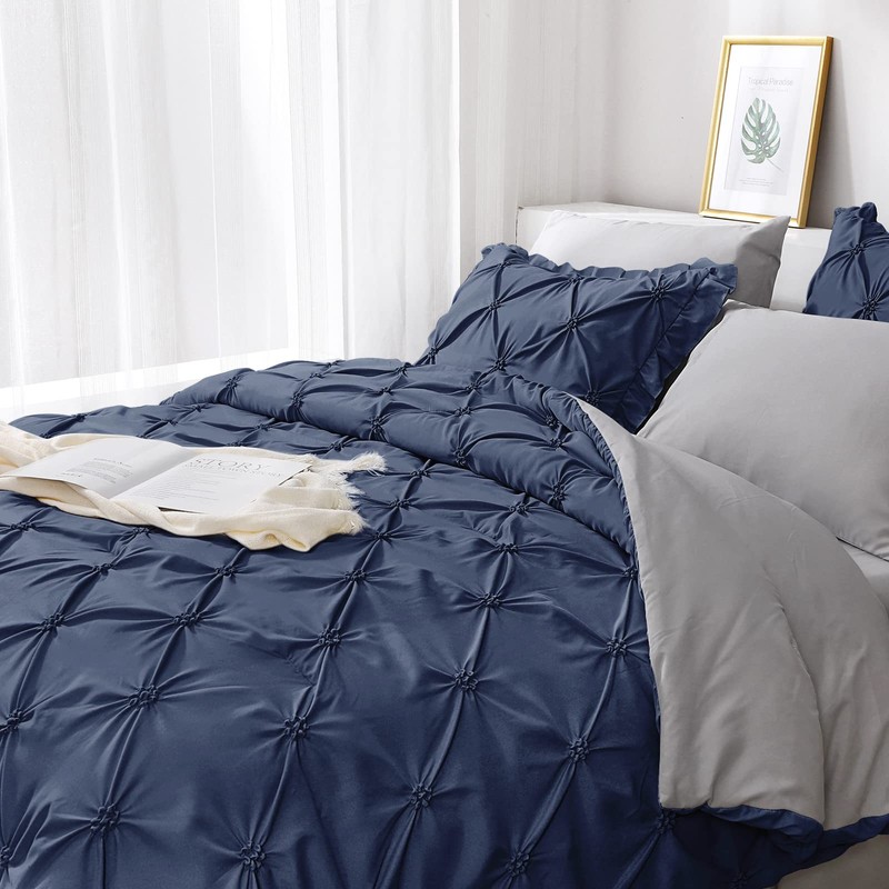 - [Elegantl Design]: These king-size comforter set are designed in a pinch pleated style that perfectly combines fashion and beauty. The pintuck and ruffled design on the two pillow shams add unique and fashionable taste to your bedroom.