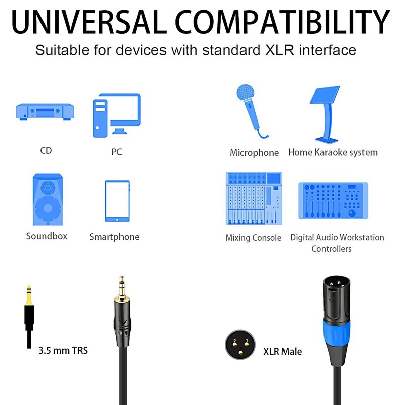- 【3.5mm Plug Design】Unbalanced 3.5mm to XLR Cable connects an smartphone, amp, MP3 player, tablet, laptop, voice recorder, or any 3.5mm audio output to a mixing console or powered speakers; Connect a smartphone with a headphone jack to XLR input. (Note: it is used for aux out to xlr in, can not run this cable from an xlr out to a mic in).