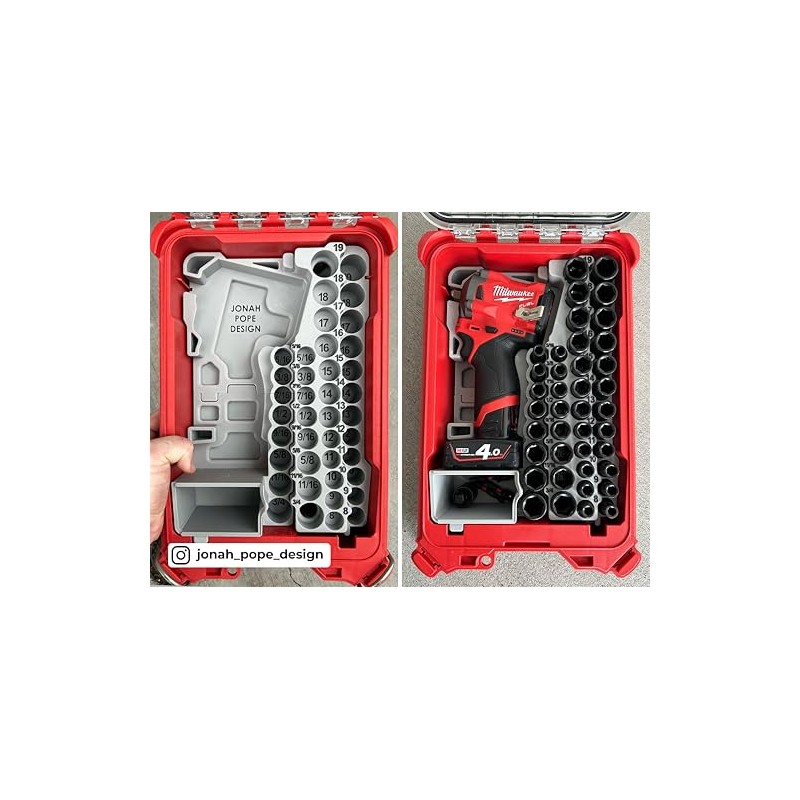 Insert only - Case and tools not included. Designed for Milwaukee GEN1 M12 Stubby 3/8" Impact (2554-20) plus the FULL 43 Piece Impact Socket Set (49-66-7009). 3D printed from PETG material for higher strength and temperature resistance.