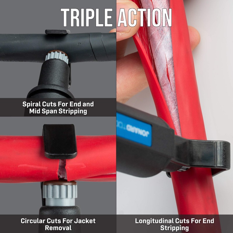 • TRIPLE ACTION TOOL: Makes longitudinal cuts for end stripping, spiral cuts for end and mid span stripping, and circular cuts for jacket removal