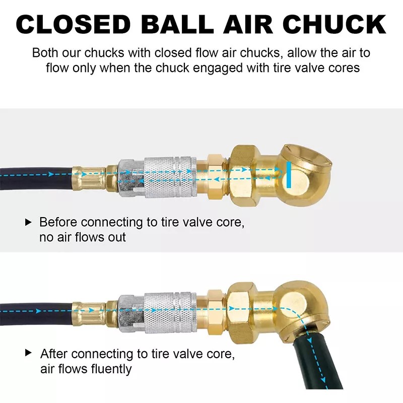 【Closed Flow Air Chuck Set】This closed-flow tire inflator chuck only allows air flow when engaged to the valve cores while shut off air flow when take it off valve cores, making sure no annoying air leakage.