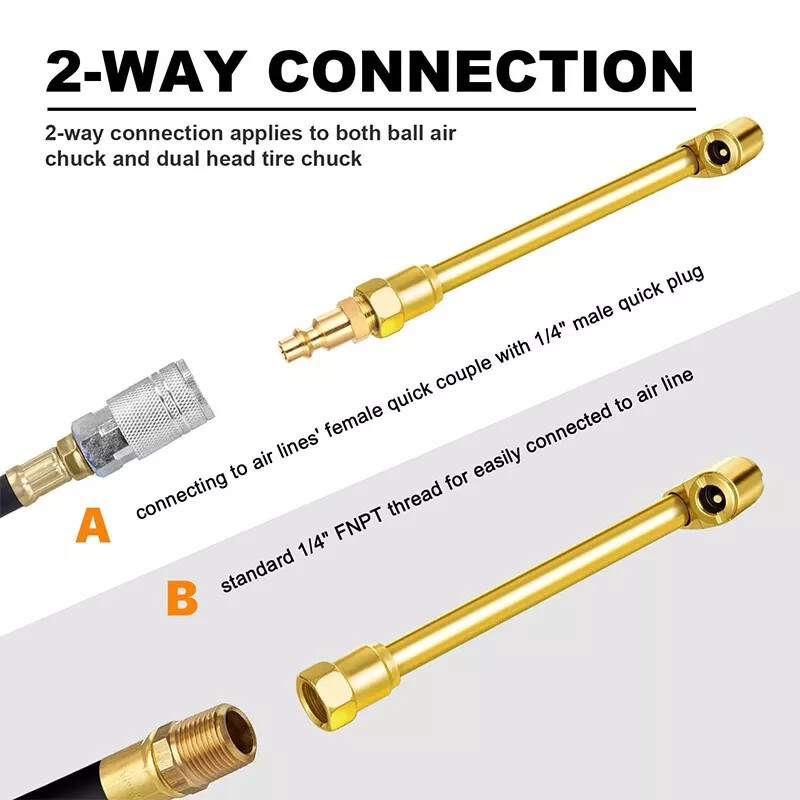 【1-Way Easy Connection】Both air chucks featured a female 1/4"NPT thread for easily connected to air lines, air compressor or tire inflator gauges for tire inflation. Also included a standard 1/4" male quick plug, for easy and swiftly connecting to air lines' female quick couple.