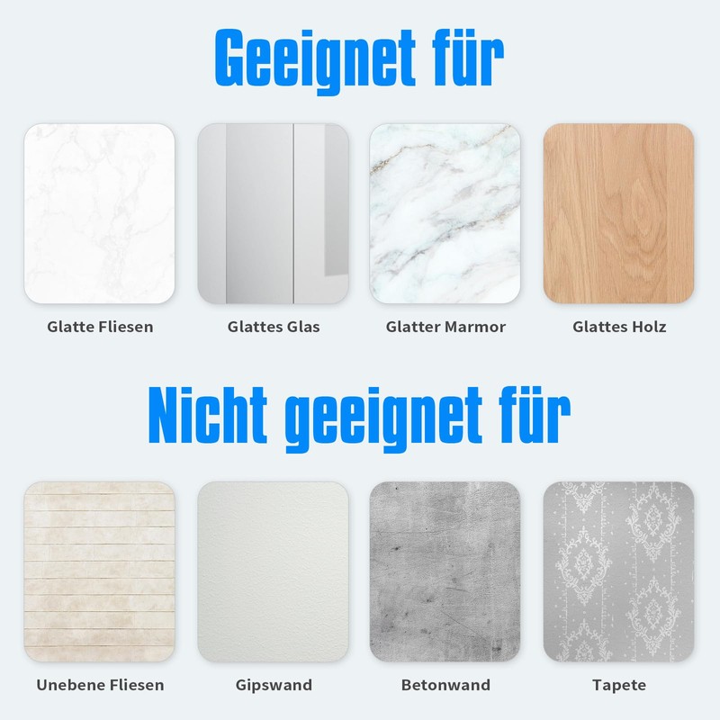- ??Breite Anwendung??: Die selbstklebende duschkopfhalterung ist f1r die meisten glatten Oberfl?chen geeignet, wie z.B. glatter Marmor, flache Fliesen, glattes Glas und Metalloberfl?chen. Es ist jedoch nicht geeignet f1r andere unebene Oberfl?chen wie Kalkzement, Trockenbau rau, uneben, zerbrechlich oder strukturierte Oberfl?chen.