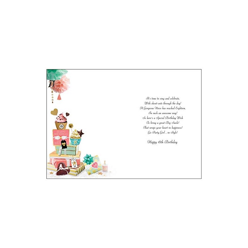 • & inside has an insert printed with the same design and reads: It's time to sing and celebrate with shout-outs through the day! A Gorgeous Niece has reached Eighteen, in such an awesome way! So here's a Special Birthday Wish to bring a great Big Smile! That wraps your heart in happiness! Go Party Girl in style! Happy 18th Birthday
