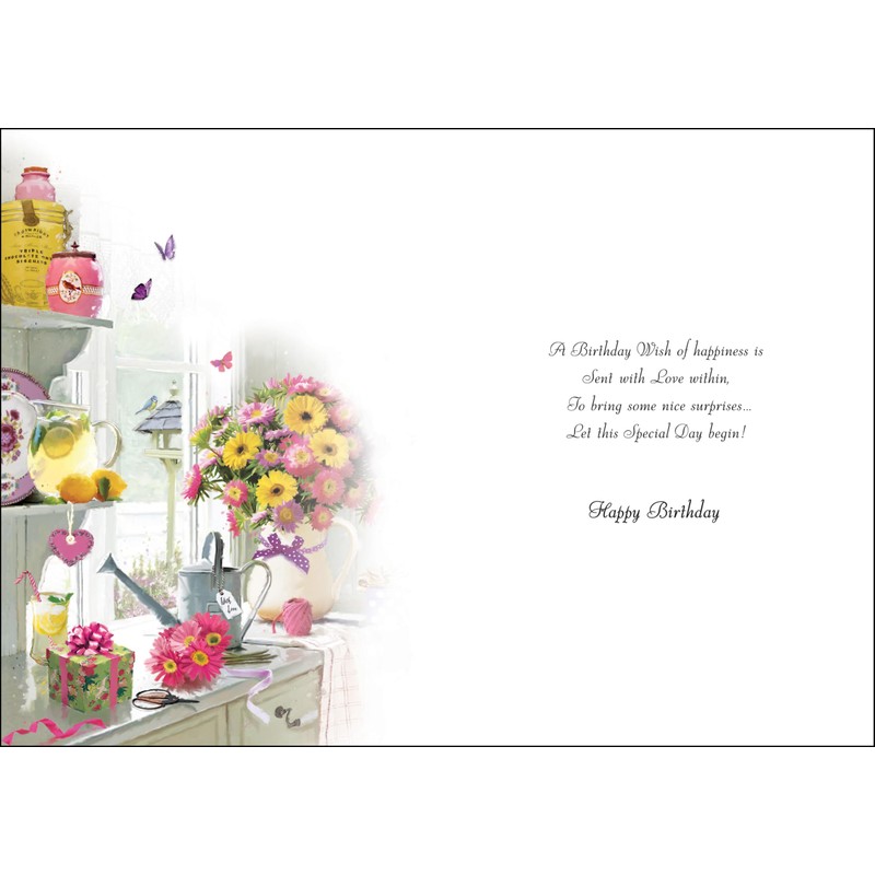 - UNIQUE BIRTHDAY CARDS: This charming birthday card features a beautiful scene of an open window with fresh lemonade and colourful flowers, with the message 'Happy Birthday to a wonderful Sister' on the front. This pretty card is finished with embossed, metallic silver foil details, making it the perfect way to celebrate anyone's big day in style.