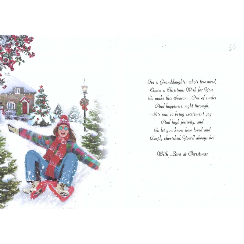- To a special Granddaughter with love at Christmas card with festive teenage girl sledging snowy design