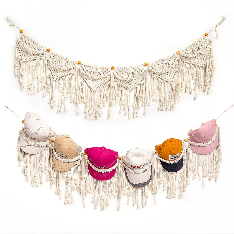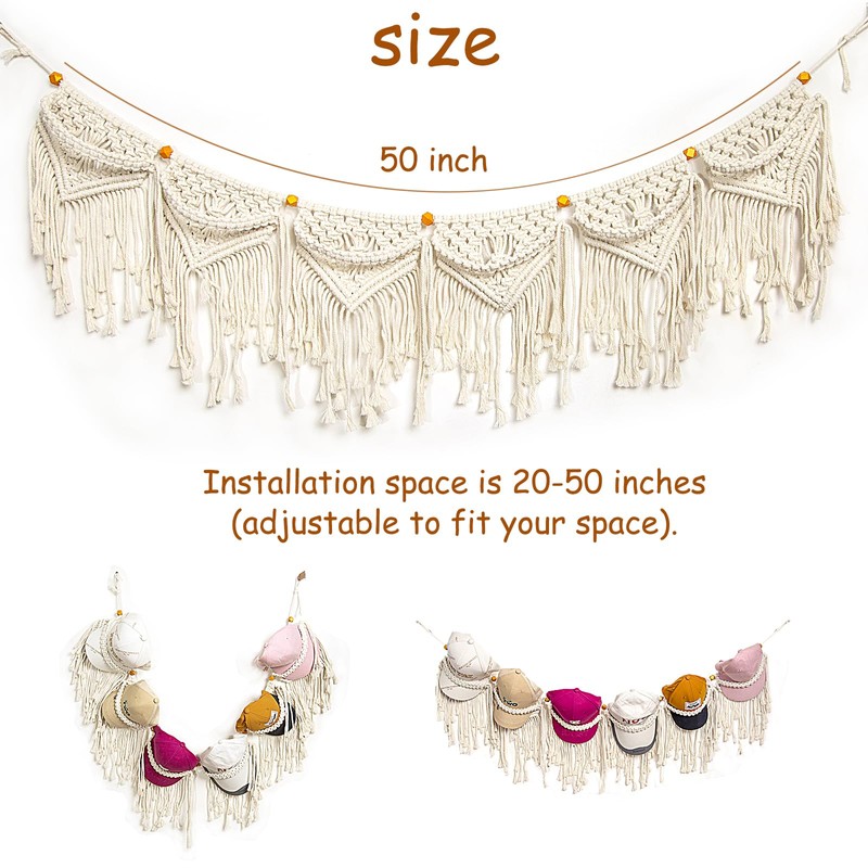 - 🎄 🎁【Space-Saving Hat Rack for Wall 】:Macrame hat hangers for wall about 6.7*50 in, suitable for different hats-besides baseball cap. This hat holder only takes up a small space on wall ,not just organize your hat neatly, also fill up space on your empty wall, A great solution to store baseball caps and it able to hang other items,for earrings, accessories and so on.