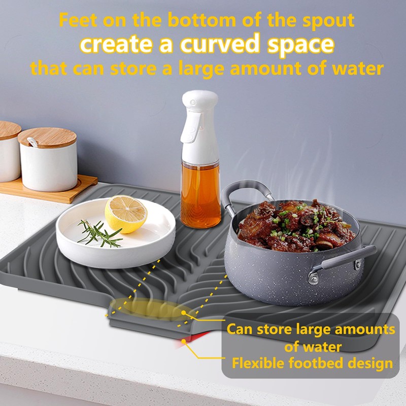 - USE BY YOUR SINK : This silicone dish drying mat equipped a side drain spout and streamlined water guides. Place it by your kitchen sink and direct the water from the dishes into the sink so you don't have to pour out the water from the drying mat.
