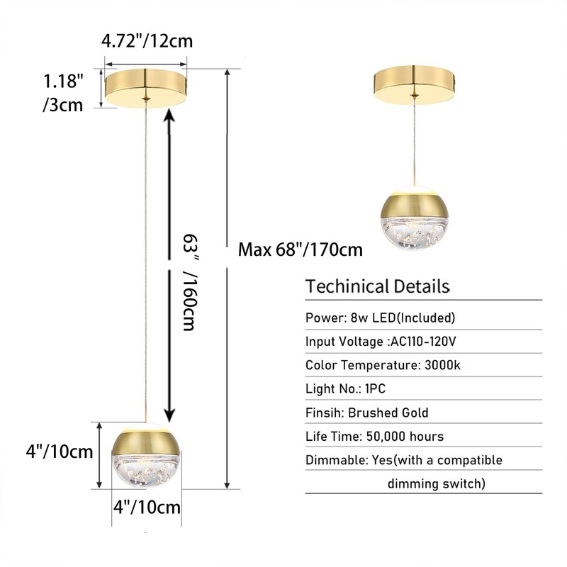 - ✔【High Performance】This brushed gold pendant light is made of high-quality glass materials, the crystal ball is solid and quite heavy, which creates nice reflection through the bubble inside of it. Note: the size and quantity of the bubbles inside the crystal may be different due to it's hand-made
