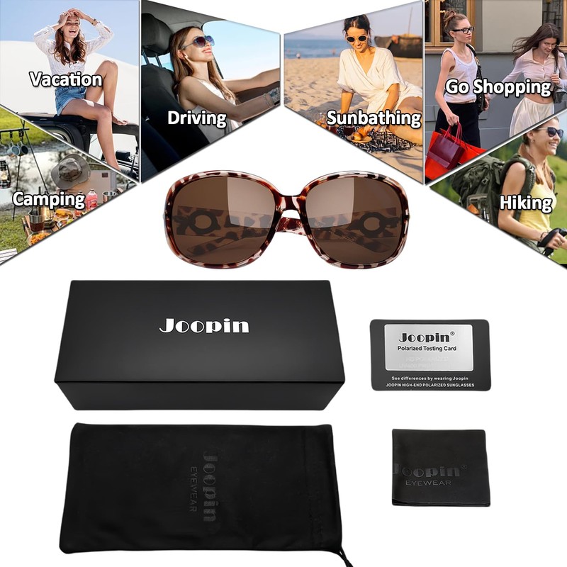 - Package Including: Joopin tortoise brown sunglasses x 1 / soft box x 1 / exquisite bag x 1 / lens cloth x 1 / polarized testing card x 1. Packaged ready, making the ladies sunglasses a wonderful idea for girl friend, wife or mom. Joopin focuses on fashion women sunglasses. Click and get your high-quality and cheap sunglasses now