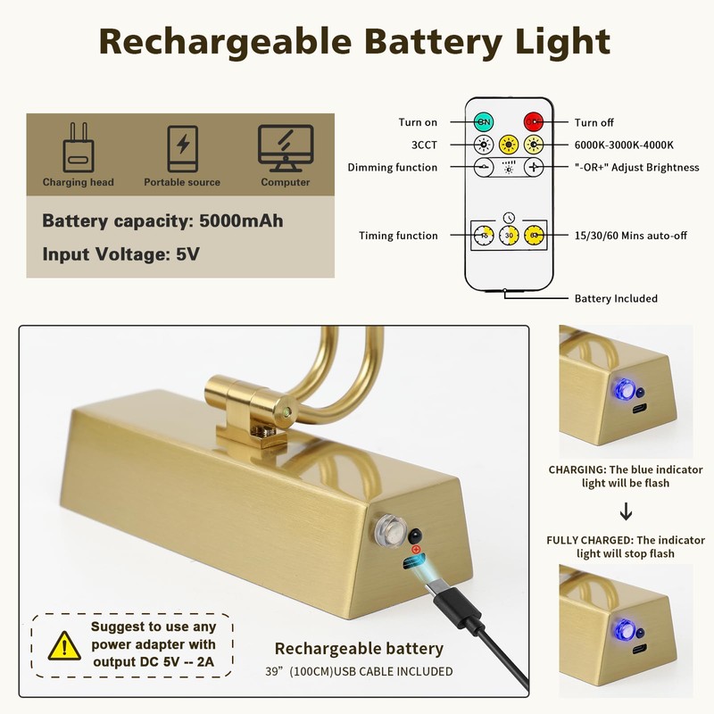 - 5000mAh RECHARGEABLE BATTERY: This Battery operated wall lights for pictures with built-in 5000mAh rechargeable battery, Compatible with universal Type C charging cable(package included). It's recommended to use a 5V 2A charger.