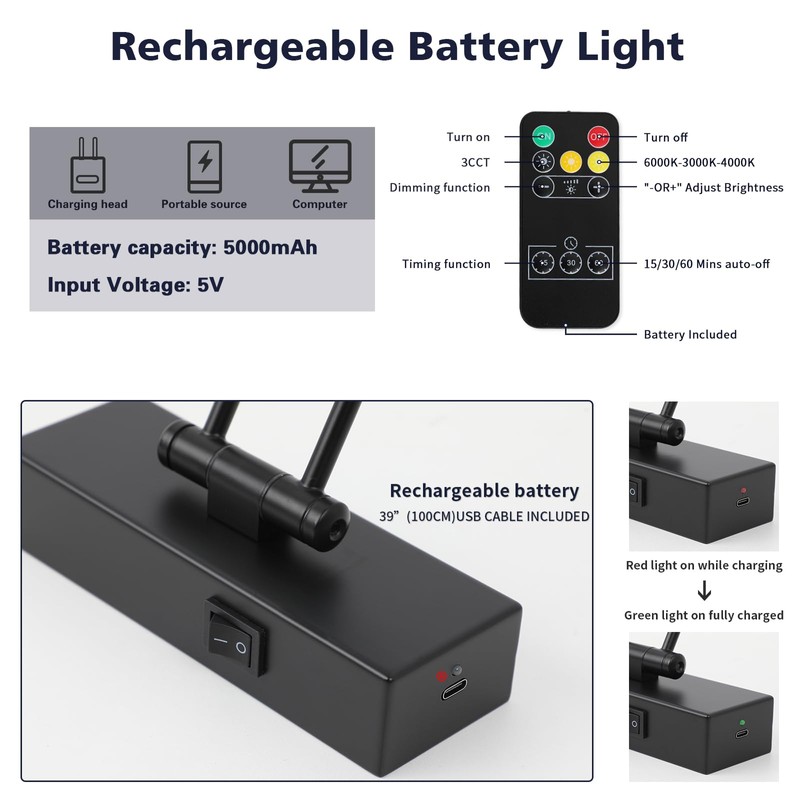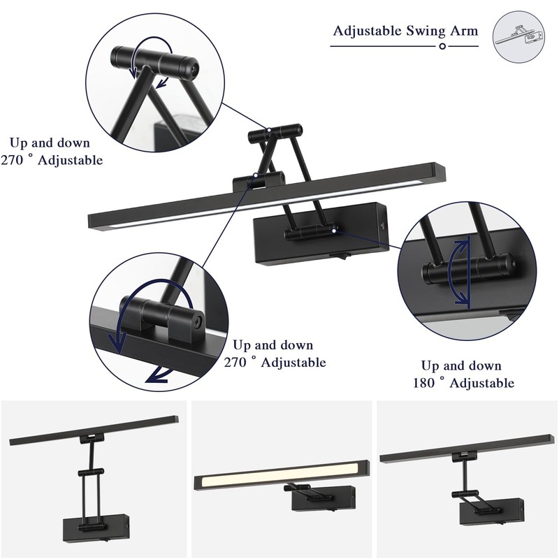 - Adjustable And Timer Function: The black wall lights for pictures is with swing arm allowing you to adjust the distance from the wall at will as a good choice of rechargeable wall sconce. above gallery lights rechargeable also has a timer function, you can set the fixed working time